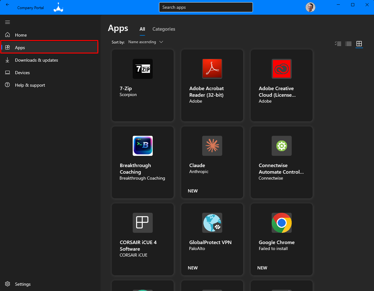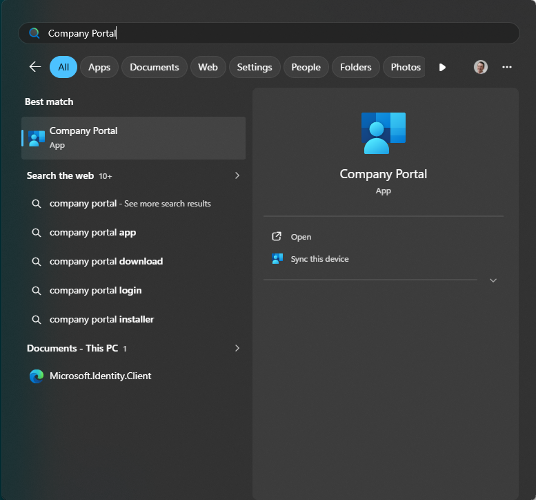 - Open the Company Portal application. This application is pre-installed on all Scorpion Windows devices. It can be found by searching "Company Portal" in the Start menu